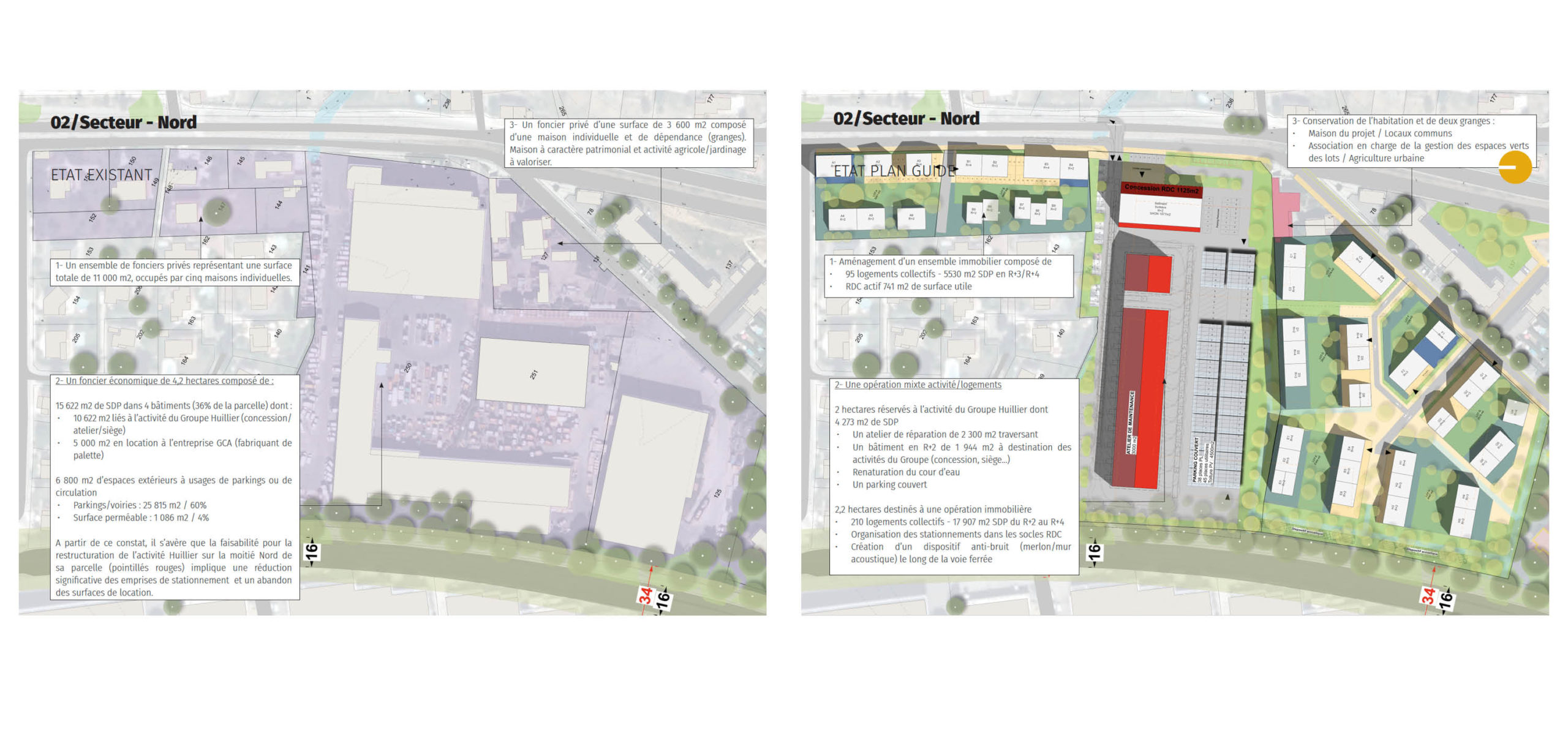 Sur la base du plan masse, nous avons choisi une stratégie par foncier, en engageant des discussions avec les propriétaires, imaginant des solutions échéancées.
