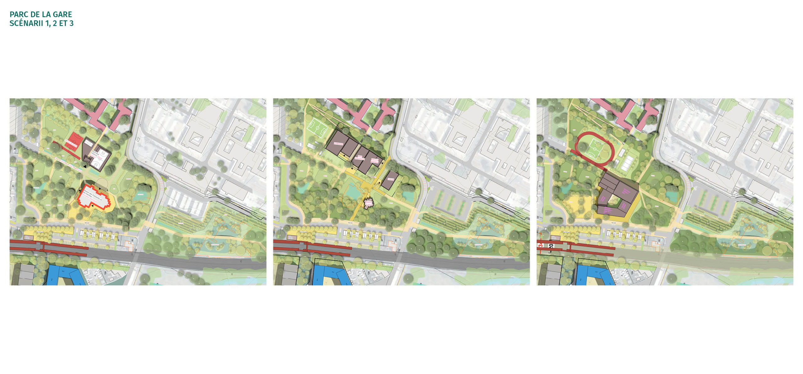 Le parc existe aujourd’hui mais dans une forme très fractionnée et aux espaces vieillissants. L’objectif est de générer de nouvelles pratiques et d’étendre le parc de la station de tramway à la gare. Ce nouveau lien paysager conforte l’inscription urbaine du quartier de la gare.