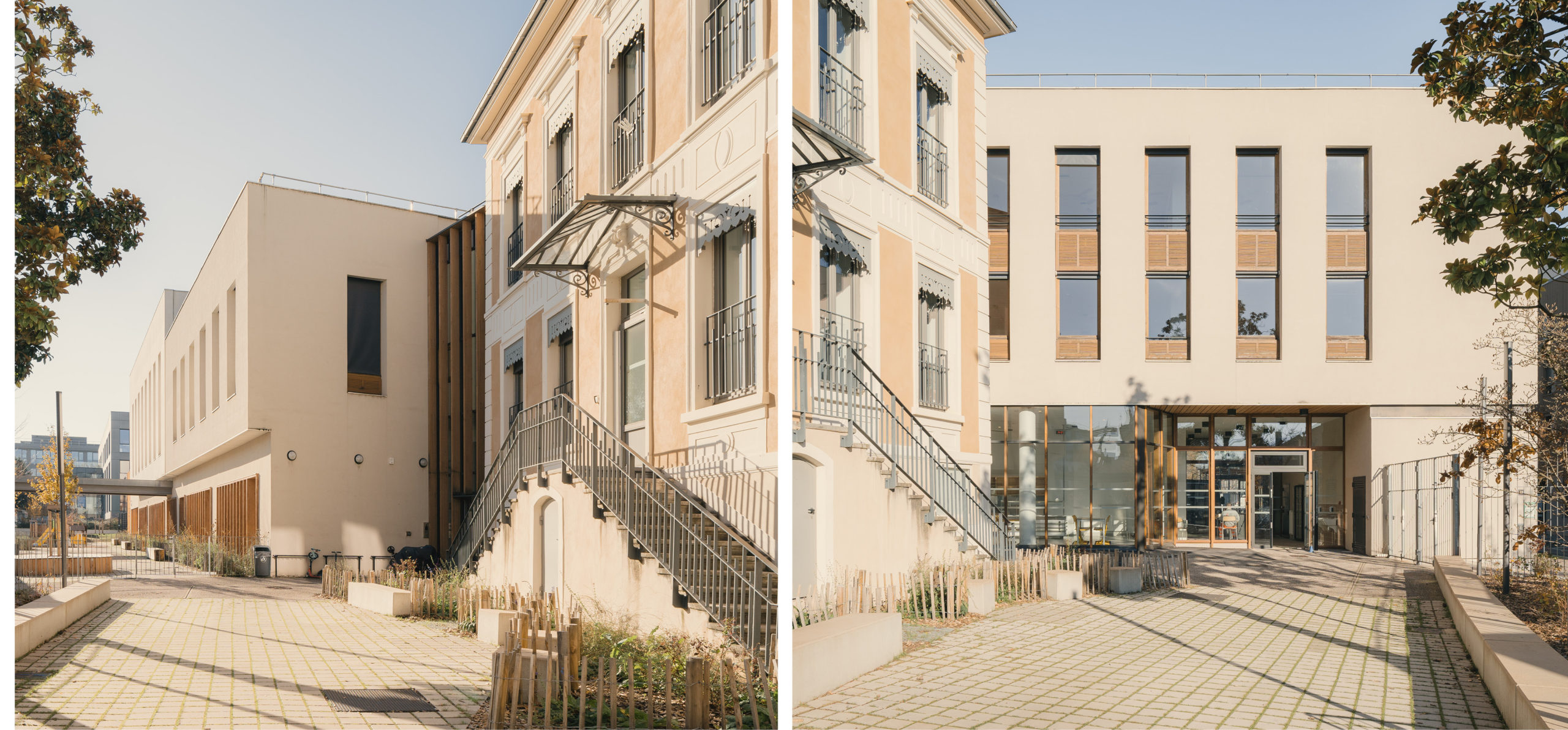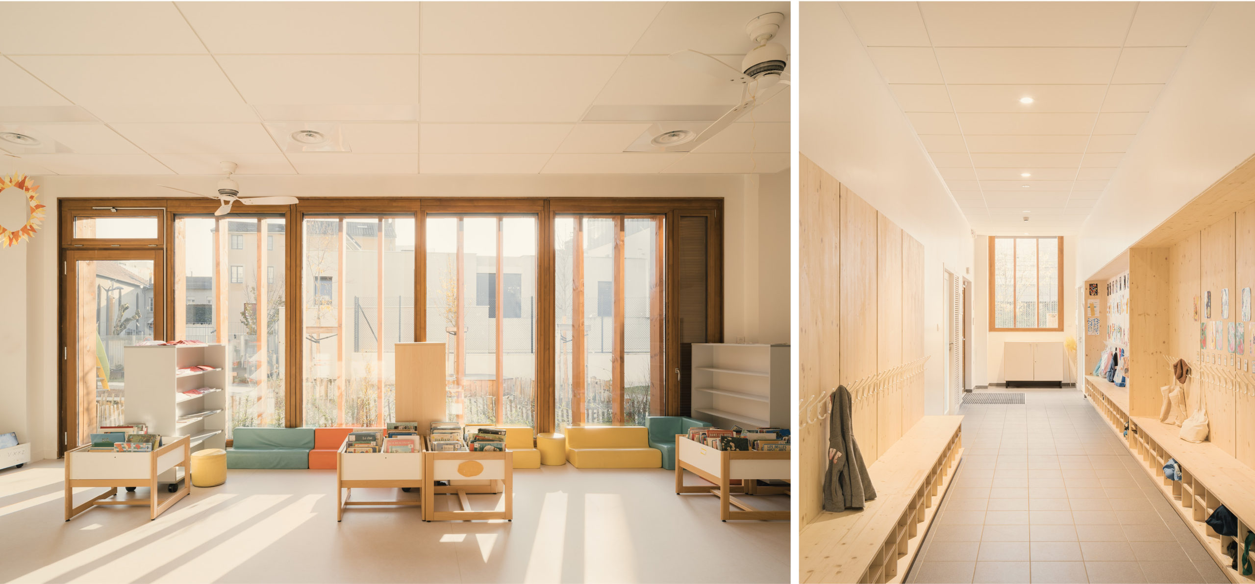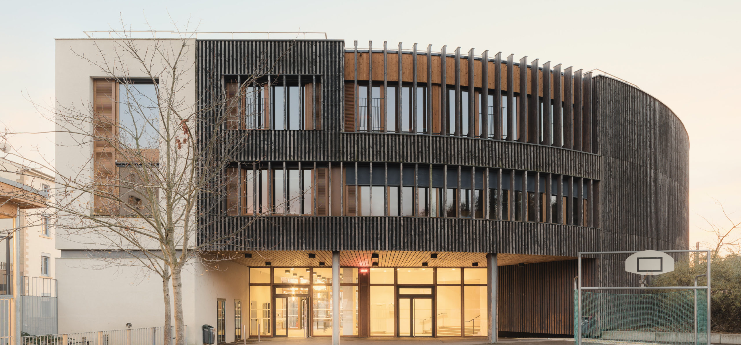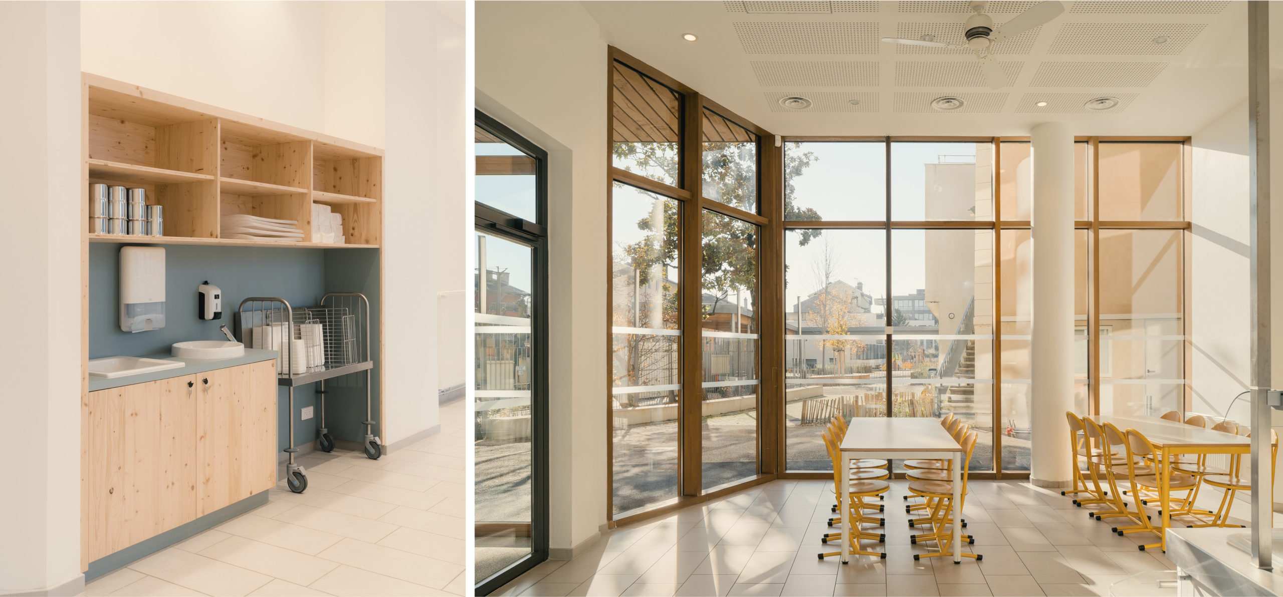Seconde souffle : 10 ans après sa livraison, la conception bioclimatique du groupe scolaire reste d’actualité. Sa ventilation traversante, ses brasseurs d’air, sa maitrise des apports solaires sont adaptés à l’accroissement des vagues de chaleur. L’extension livrée en 2024 ajoute 4 classes et agrandit le restaurant scolaire. Construite en bois et biosourcés, avec une végétation des cours densifiée, elle s’aligne sur la trajectoire de Lyon vers une ville climatiquement neutre en 2030.