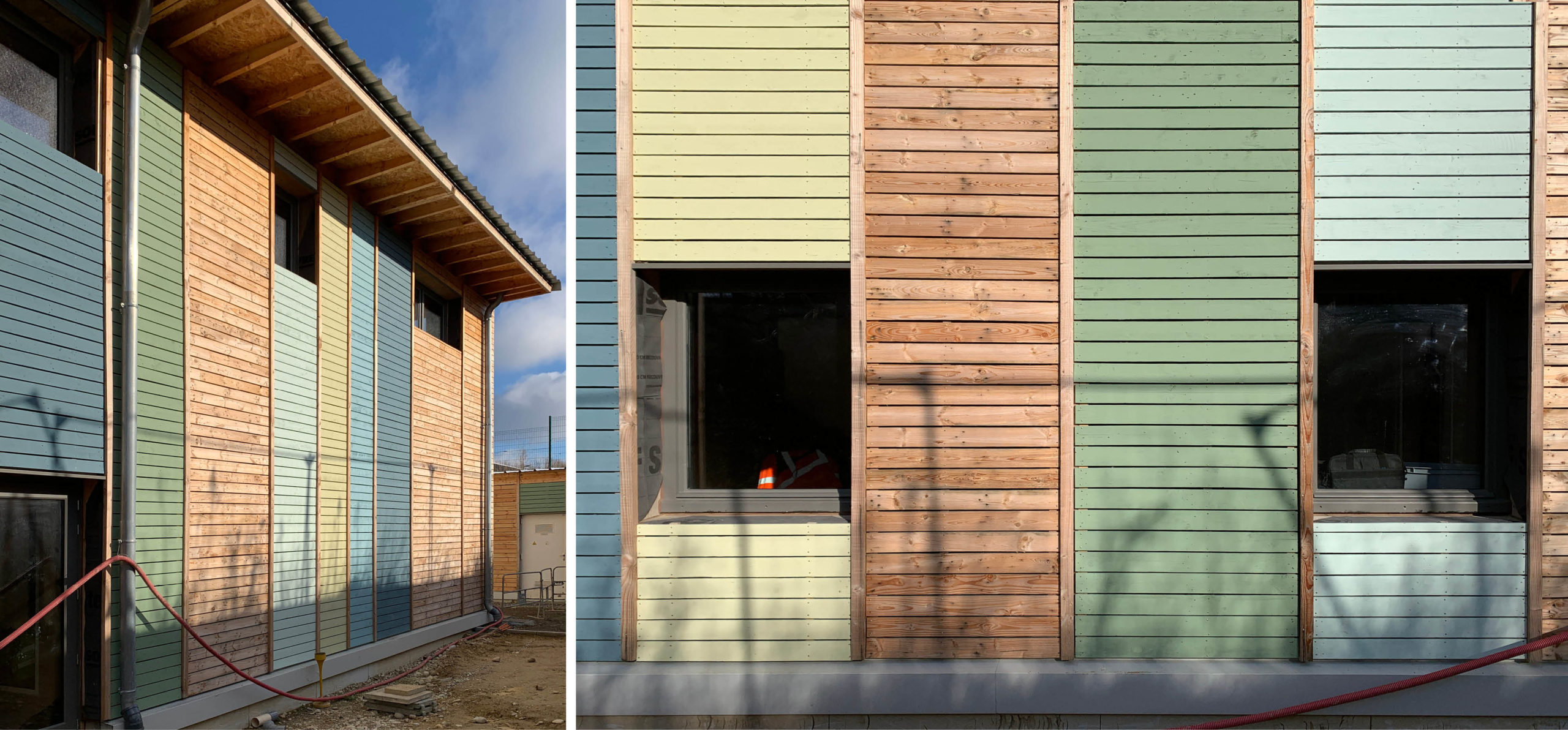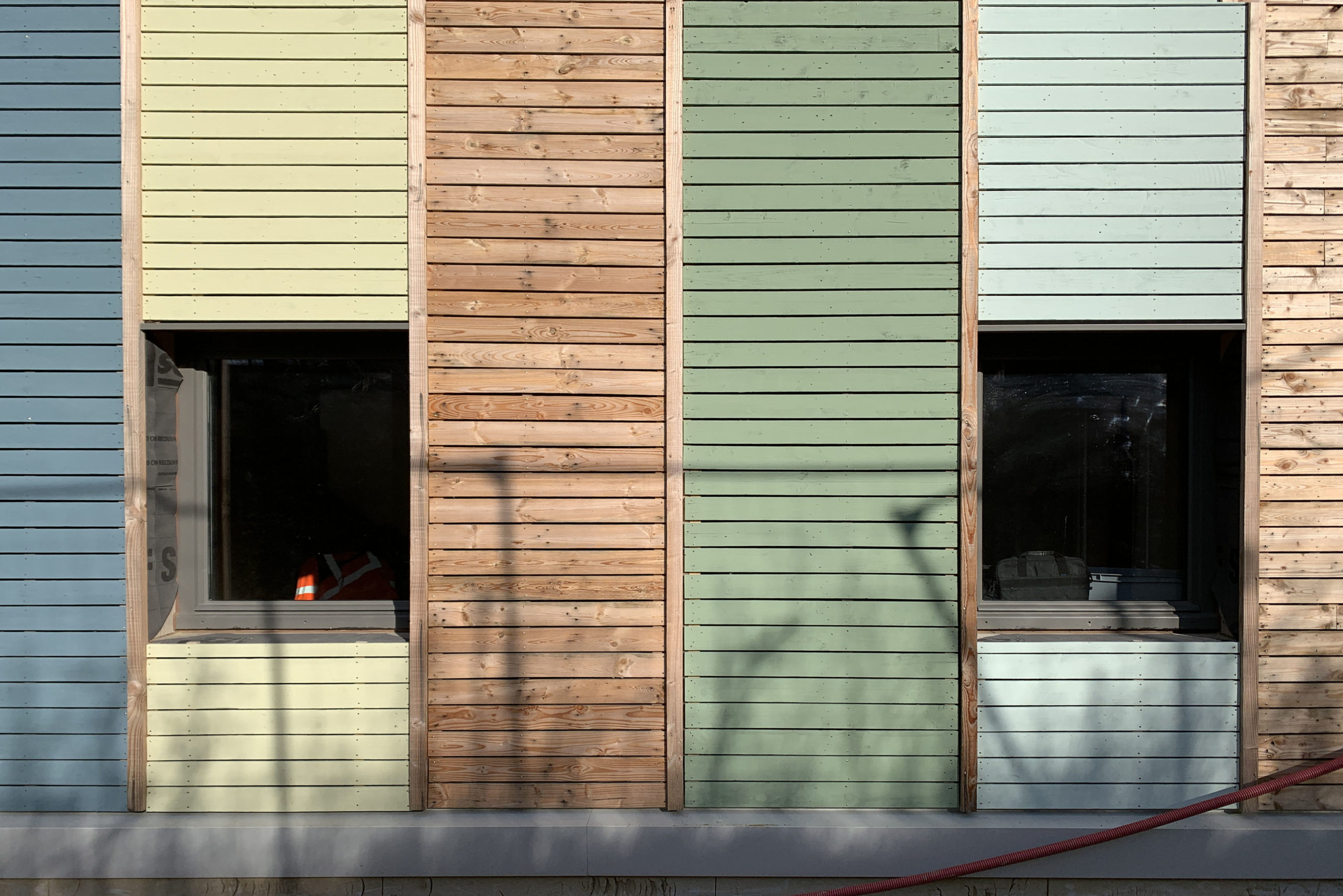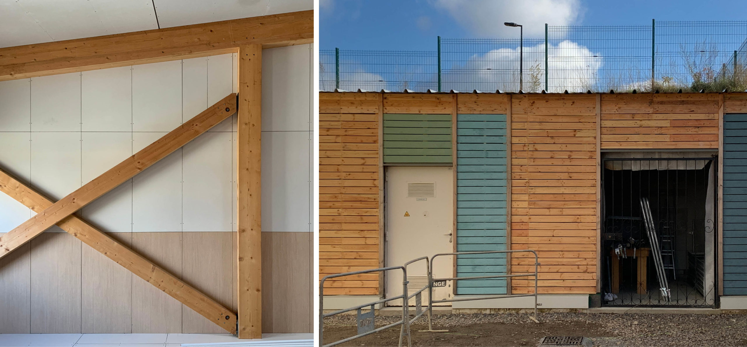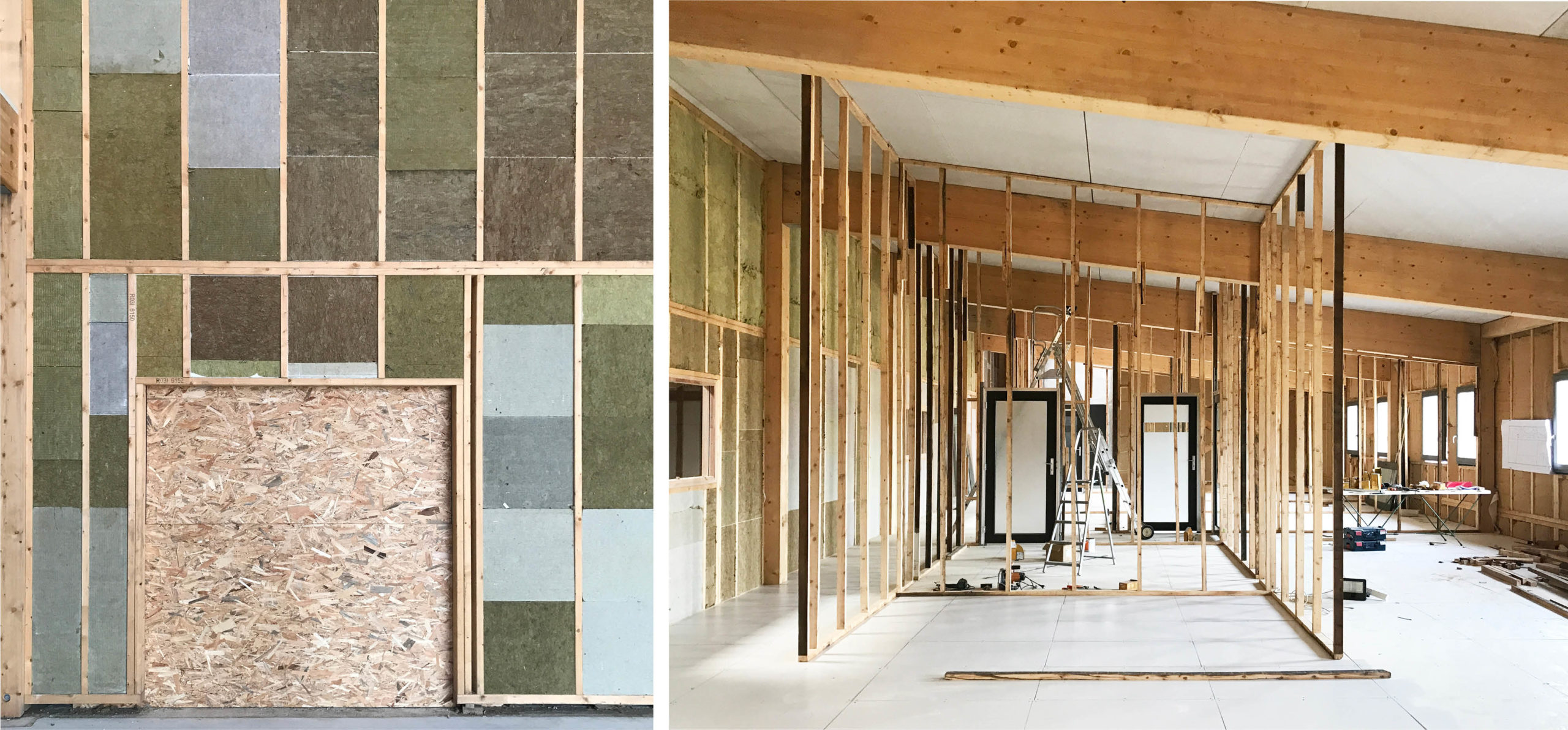 Sur un squelette de charpente en bois local, 50% des matériaux sont issus du réemploi : les façades affichent un bardage issu de bois de palettes désossées, peint ou huilé. L’isolant des murs compile des dalles de plafonds doublées de chutes de fermacell. Le plancher de la mezzanine recycle d’anciens plateaux de bureaux. Les équipements électriques et sanitaires, testés et approuvés sont de seconde vie. Près de 280 t de matériaux ont été récupérées en 1,5 an. Des fiches produits assurent leur traçabilité.
