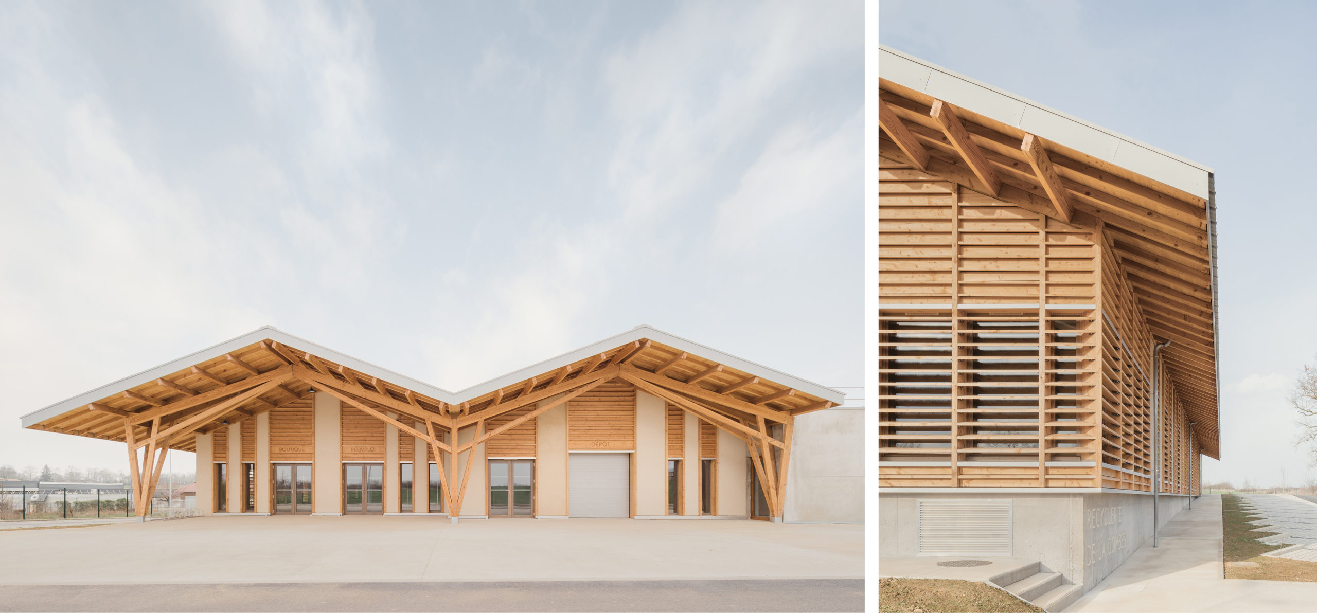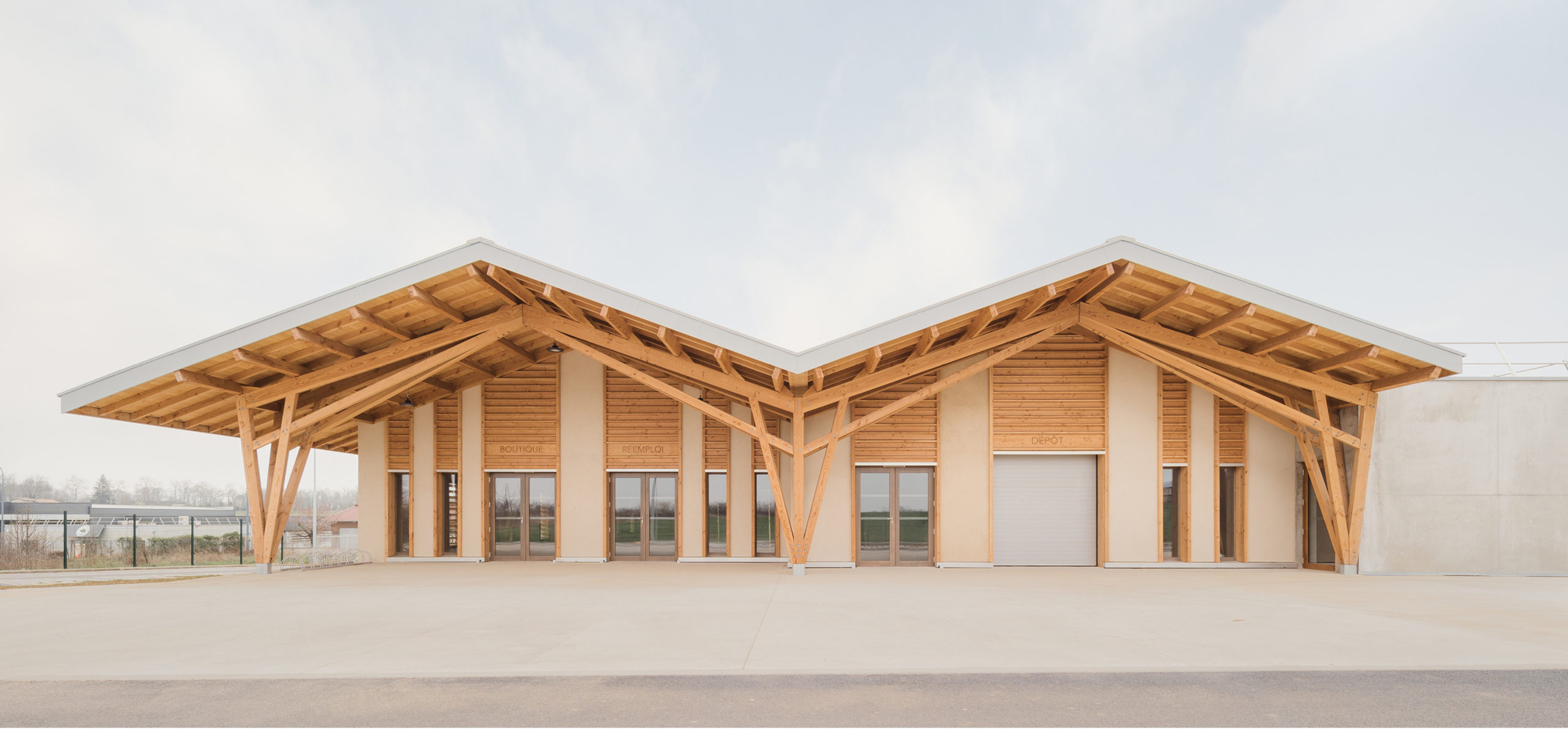 Réinterpréter le colombage : L’architecture proposée pour la recyclerie s’inspire du modèle de la halle et des bâtiments en pans de bois, si magnifiquement représentés à Châtillon-sur-Chalaronne. Elle est intrinsèquement liée aux principes bioclimatiques avec ses grands débords de toit et lames bois brise-soleil. La structure bois est apparente et les façades sont écrites par le système constructif à ossature bois avec une alternance de trames vitrées complétées d’un bardage bois, et les trames pleines en enduit chaulé.