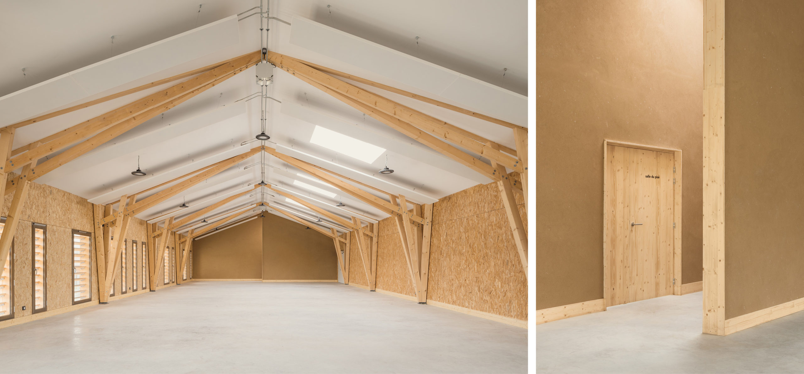 Économiser la matière : Le projet se veut avant tout frugal. La conception a été menée en cherchant l’optimisation de la quantité de matière et en favorisant l’emploi des ressources locales ou issues du réemploi. L’architecture affiche l’engagement de réduction de l’empreinte carbone de l’acte de bâtir en utilisant massivement le bois et la terre de site.