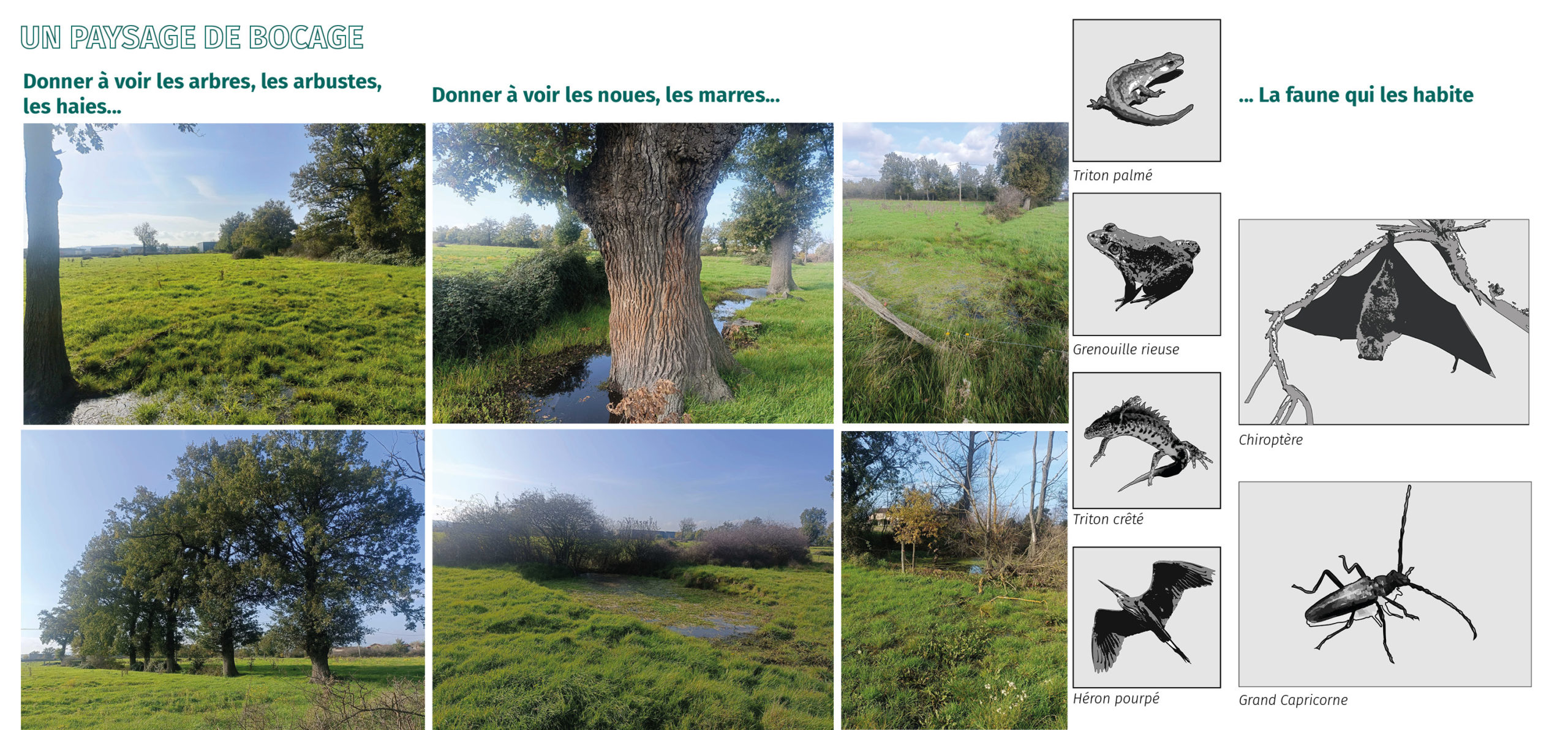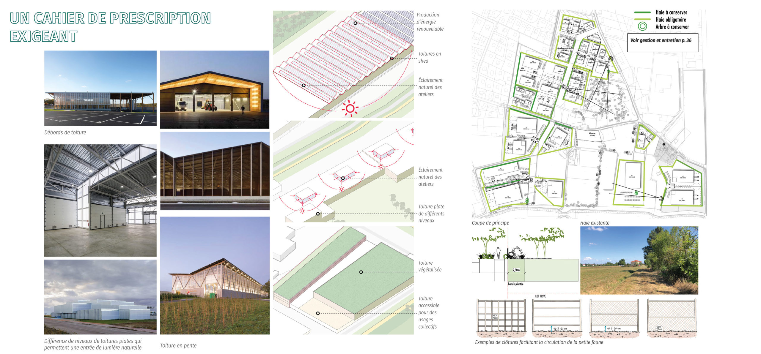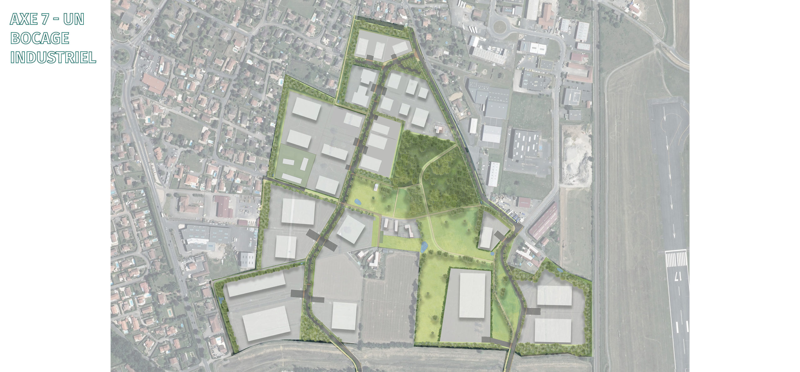 Installer un parc d’activité pensé comme un quartier, dans une optique d’optimisation et de sobriété foncière / Préserver la trame écologique, les linéaires de haies et les chênes remarquables